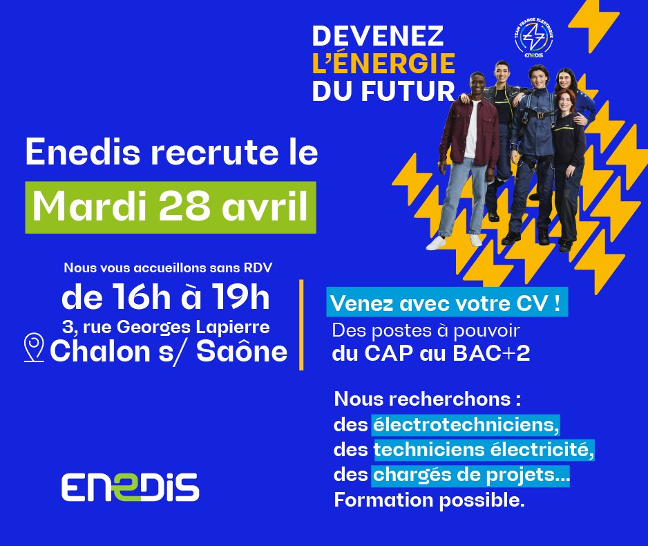 Enedis organise un job dating le mardi 28 avril, 3 rue Georges Lapierre à Chalon sur Saône.