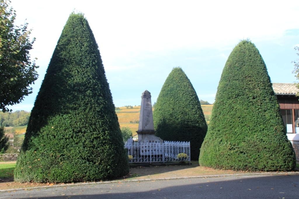 Sur l’ancienne photo, vous trouvez l’école des filles qui fut construite en 1866-1867 et son préau qui fut ajouté en 1894. Contre le bâtiment de l’épicerie, à droite, on voit un appentis collé à lui, mais qui n’existe plus actuellement. Après la guerre de 14-18, le monument aux morts fût érigé. Et la verdure fut ajoutée... par 4 ifs (If commun Taxus baccata) sur les angles de la placette du monument aux morts. Puis un if à la place de l’appentis a été planté il y a environ 15-20 ans par la fille de l’ancienne épicière qui a habité dans cette maison durant quelques années. Ces ifs "récents" ne sont donc pas issus de l’ancien cimetière qui entourait l’église autrefois.