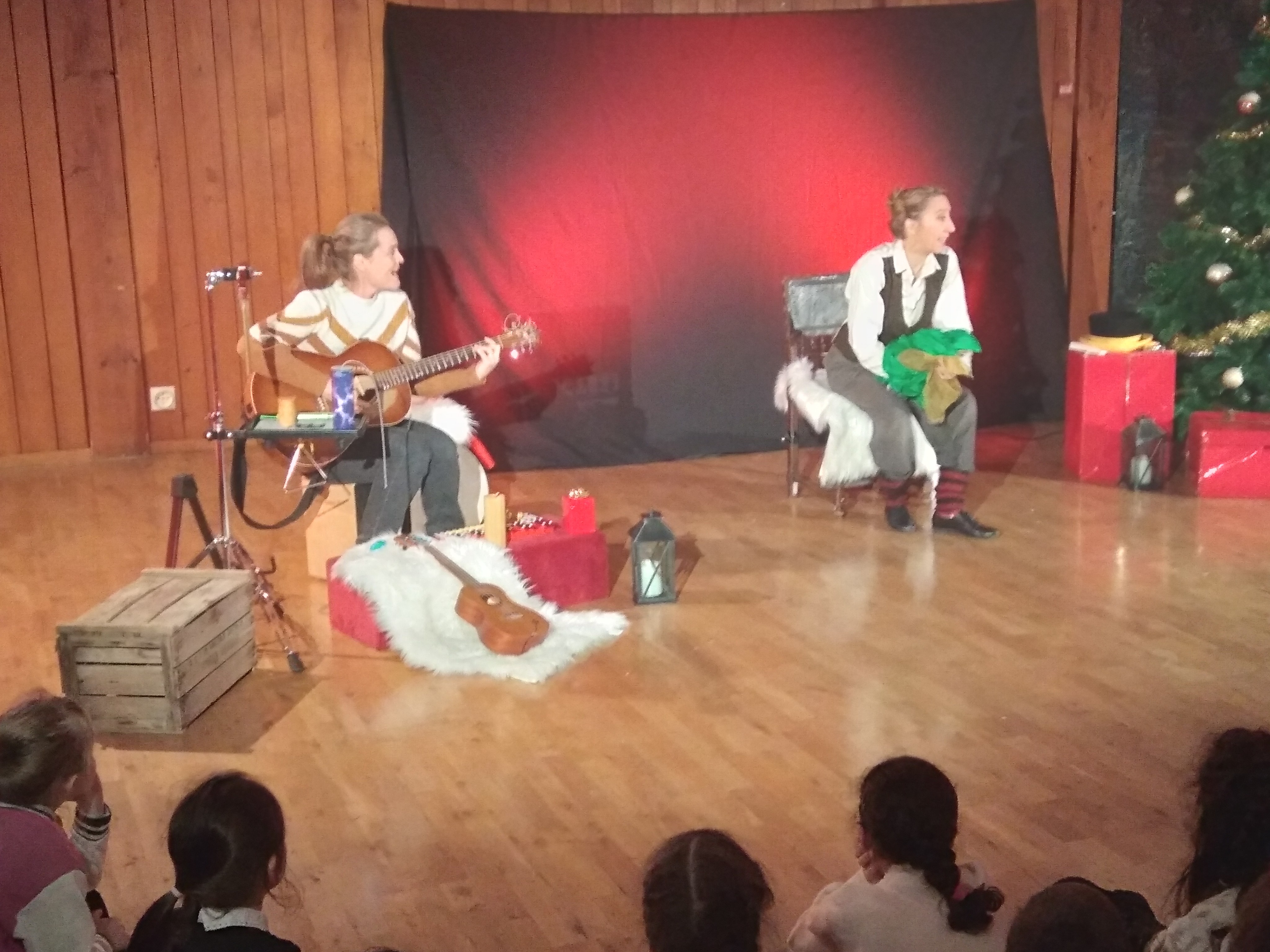 Mardi, les élèves de l’école élémentaire se sont rendus au tinailler du château d’Hurigny pour assister au spectacle La nuit avant Noël de la Compagnie de l’Alouette. Sur scène, une comédienne et une musicienne ont fait voyager les enfants dans le monde magique de Noël. Guitare, chants et bruitages en tout genre ont accompagné trois contes d’époques différentes dans lesquels il est toujours question d'un étrange vagabond. Partage, générosité et hospitalité ont été le fil conducteur des histoires contées. Enfants et enseignants ont grandement apprécié ce spectacle offert par le Sou des Ecoles présidé par Vincent Saverot.